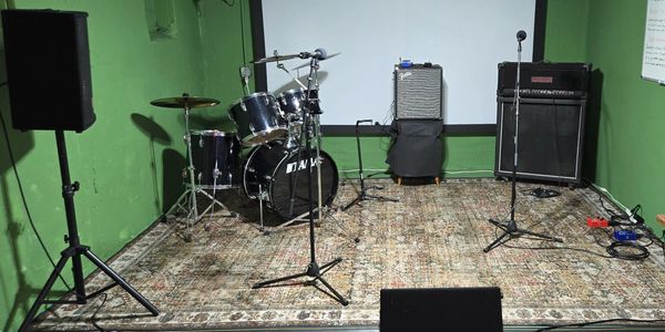 Studio "M" (The Green Room) is a fully equipped home studio in my basement on the north side of Waukegan — no need to haul a ton of gear! The space has a five-piece drum kit, two guitar amps, a bass amp, and a full PA system. Just bring your guitar and pedals, and you’re good to go. Let’s jam!